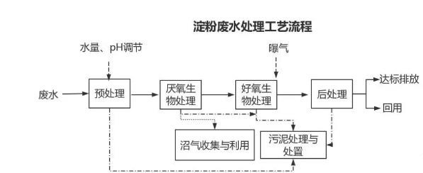 從總體上看,對淀粉廢水的治理宜采用“預處理+厭氧生物處理+好氧生物處理+深度處理”的污染治理工藝,工藝流程圖如下: